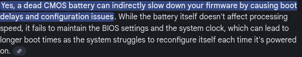 E recentemente, a bateria do CMOS abriu o bico, com o notebook volta e meia reclamando que a Data e Hora está incorreta, e no systemd-analyze mostra que o sistema demora muito no Firmware: