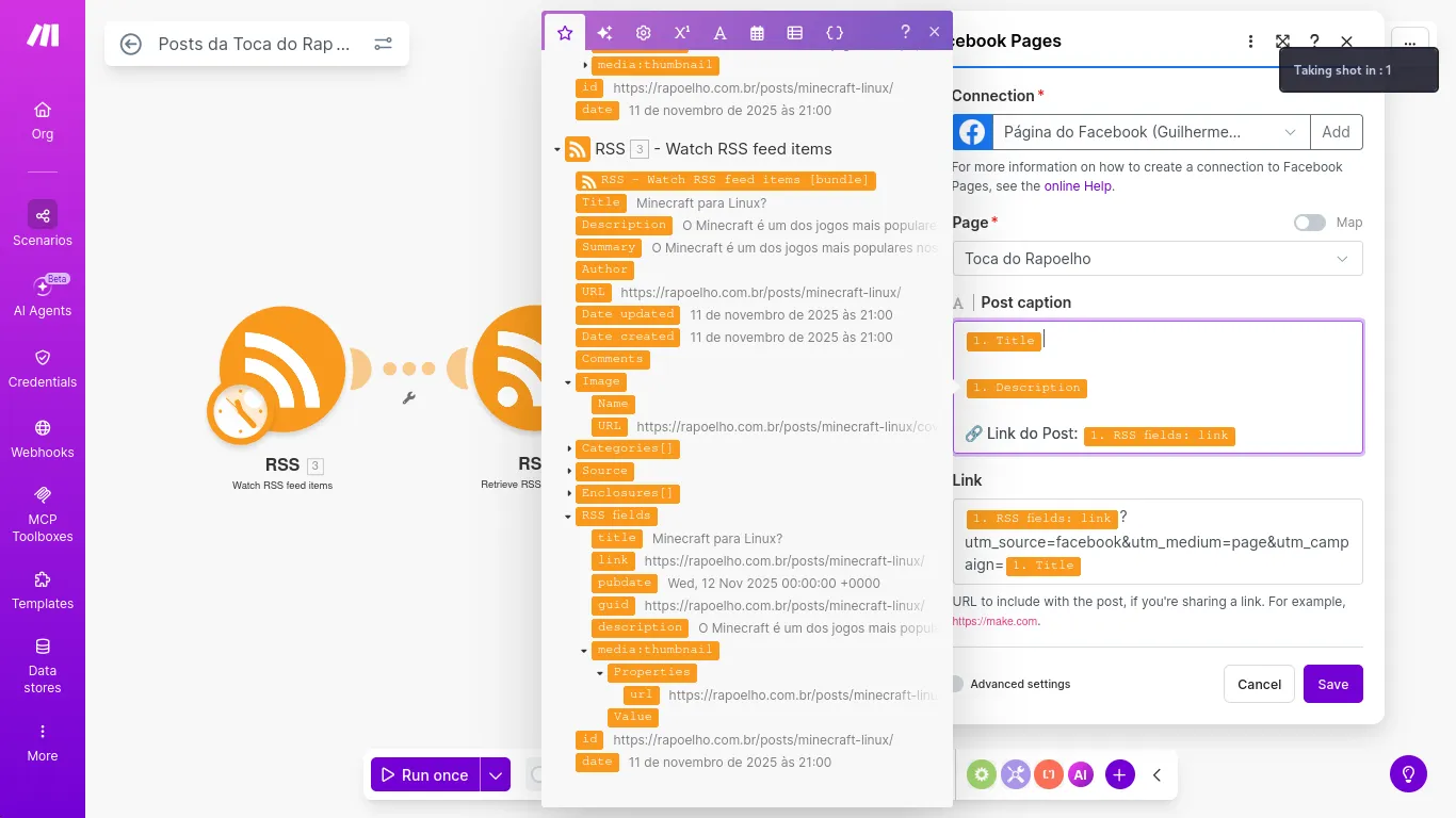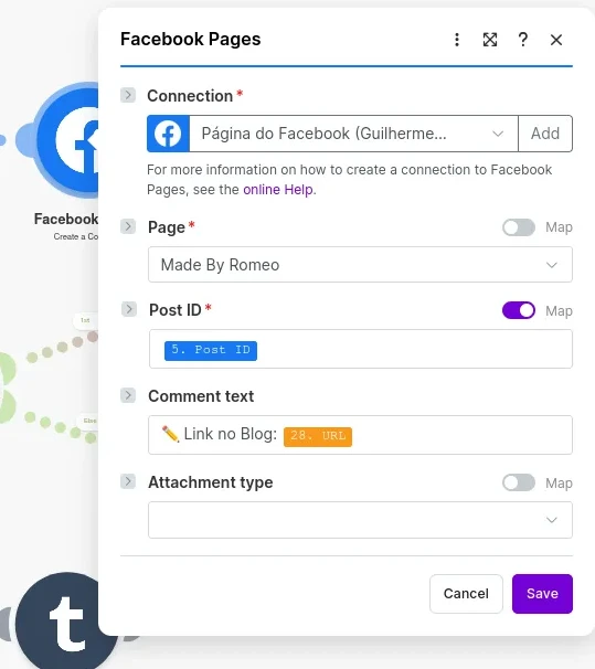 Uma coisa legal do Facebook no Make, é que é possível adicionar um comentário em uma postagem. Aqui, ele pega o ID do post e cria um comentário com a URL da postagem do Blog.
