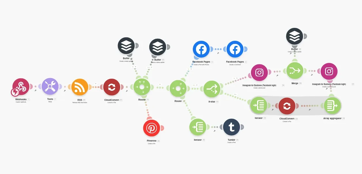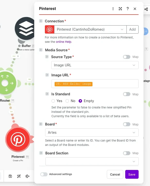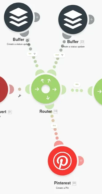 Logo depois, temos um Router para o Pinterest, outro Router e dois módulos do Buffer. Isso se fez necessário por dois motivos: O Twitter/X não é suportado oficialmente no Make.com e configurar o Bluesky é um trabalho de corno.