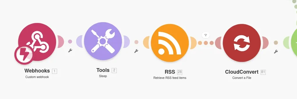 E todo esse Pipeline é dividido em cinco partes. Primeiramente, temos o começo de tudo. Um Webhook, um Timer de 3 minutos, um leitor de RSS e um conversor de imagens, pois já tive problemas com as imagens nos módulos do Make.