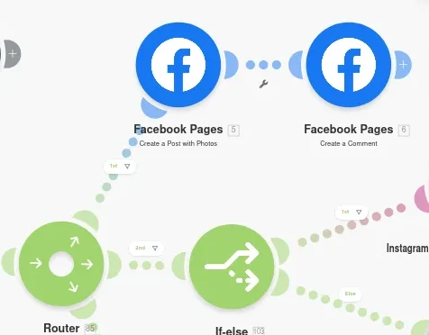 Depois disso, temos um segundo Router, que vai para o Facebook, Tumblr e Instagram. O do Facebook é bem simples: Posta no Facebook e cria um comentário naquela postagem com o Link da Postagem no Blog.