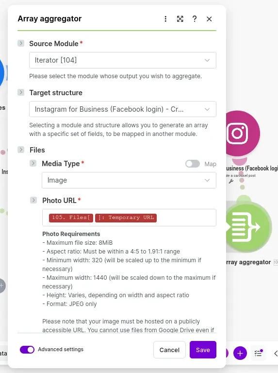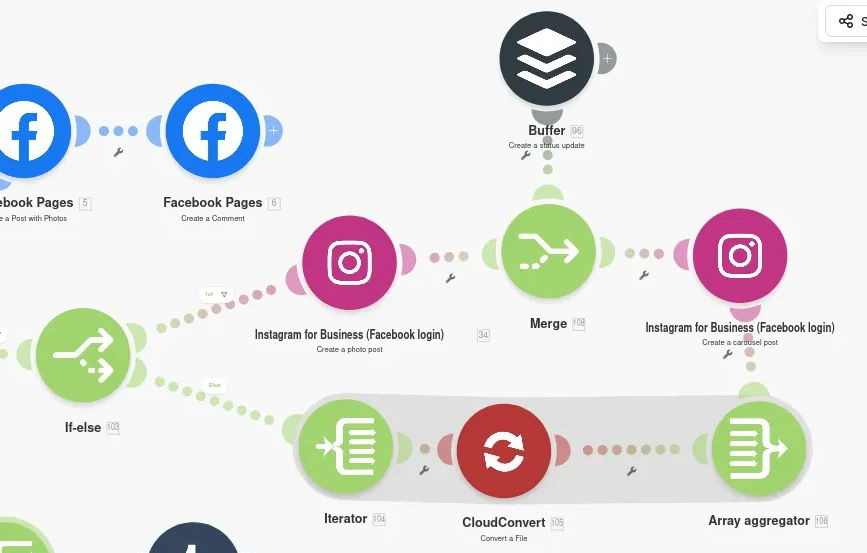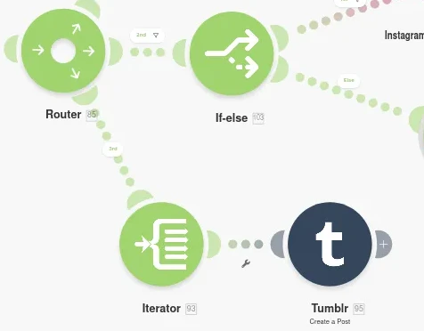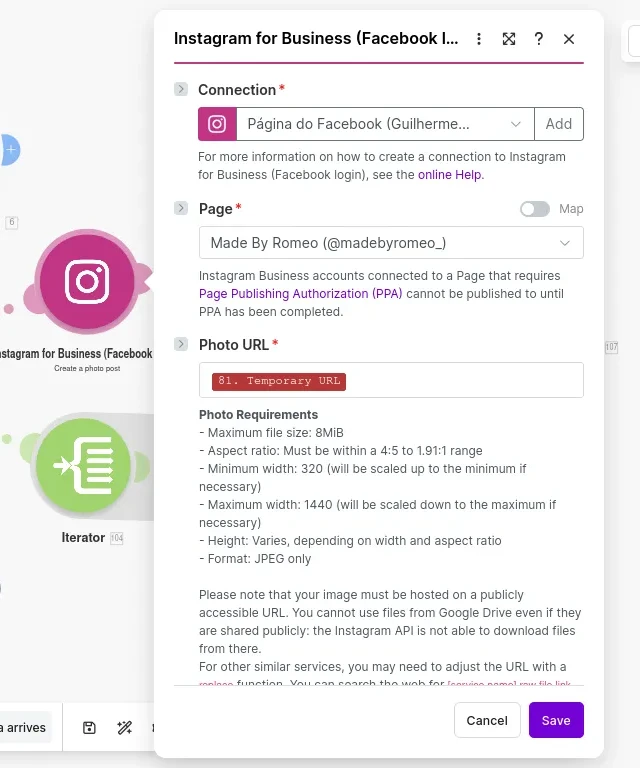 Já o Instagram, foi bem interessante aqui, pois há duas formas de postar imagens no Instagram: Um post com uma única imagem, ou um Carrossel. E como eu quero postar das duas formas, eu usei um módulo de “If-else”.