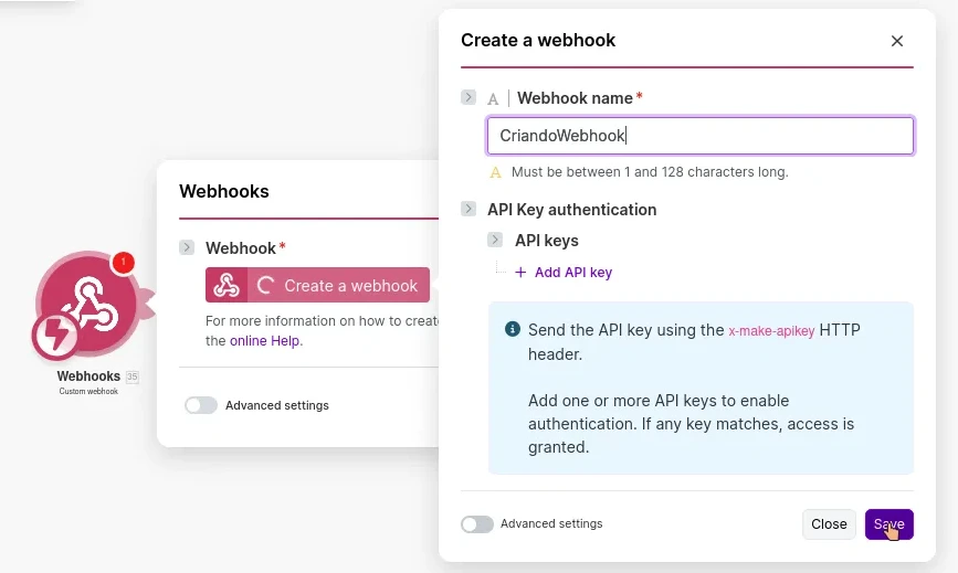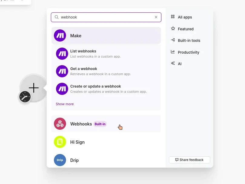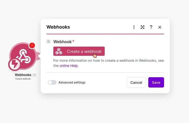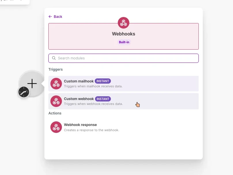 A criação do Webhook é muito simples. A primeira coisa que se deve fazer, é criar um Módulo de Webhook. Assim, pesquise por “webhook” e clique no módulo…
