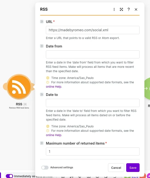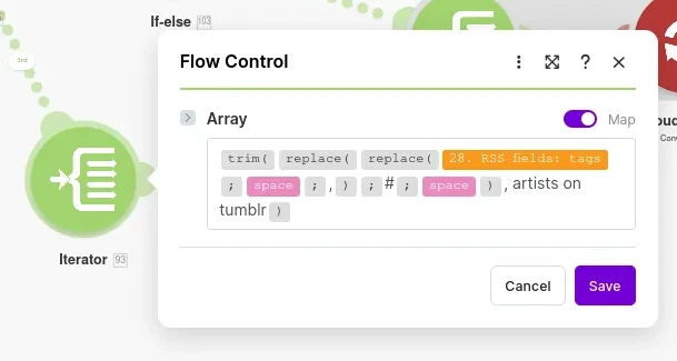 Já para o Carrossel, é um pouco mais complexa. Primeiramente, precisamos separar as URLs que estão no parâmetro do Carrossel no RSS. Isso é feito com o módulo de Iterador, onde é usado um comando de split que separa as URLs…