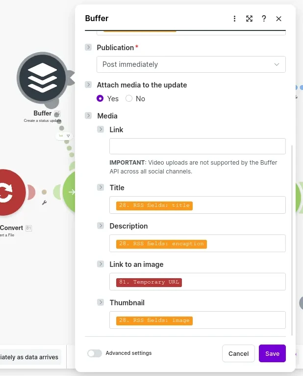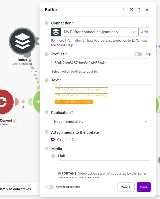 O Buffer aceita até três contas em sua versão gratuita e o uso dele no Make é legal justamente para módulos que não existem oficialmente, como o caso do Twitter/X e do Threads, ou para aqueles em que a configuração é mais complicada, como no caso do Bluesky.