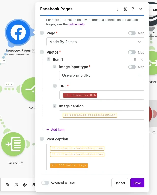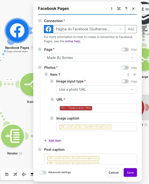 O Facebook também é bem simples. Basicamente, você seleciona a Página em que o post será feito, configura a URL da imagem a ser postada (Aqui é usada a URL temporária que foi dado pelo CloudConvert), a Legenda da Imagem e o Texto da Postagem.