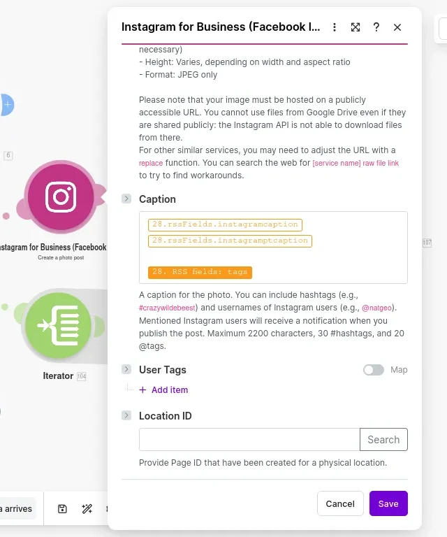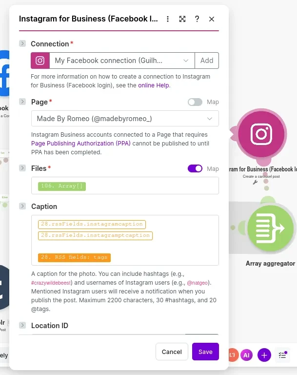 … que por fim, é repassada para o módulo de Carrossel do Instagram. A única diferença desse módulo para o que posta uma única imagem, é justamente a Matriz com os arquivos.