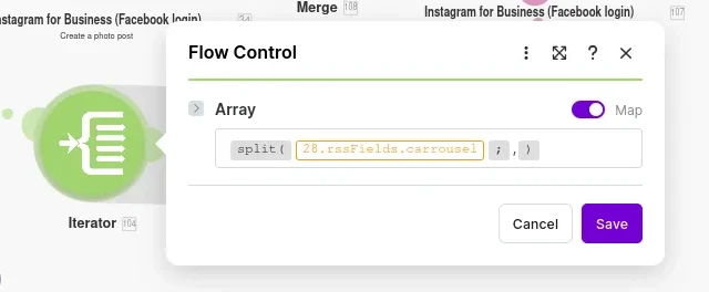 Tudo começa com o campo de Instagramcarrousel. Se for Falso, segue para a postagem normal, de uma única imagem. Se for Verdadeiro, segue para algo que irá separar as imagens do carrousel, repassar cada uma das imagens para o Conversor e depois para uma Lista formatada de acordo com o que o módulo de Carrousel aceita.