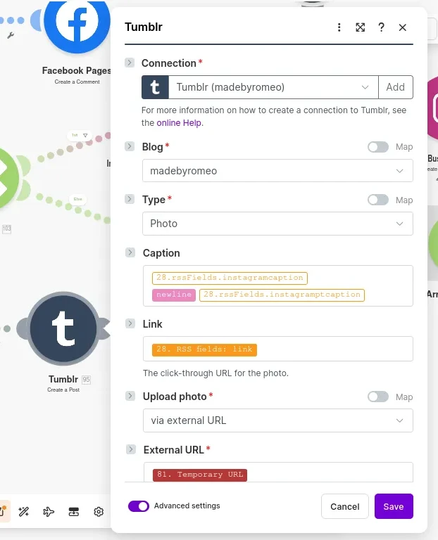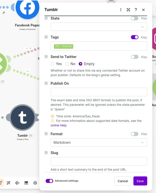 E por fim, isso é repassado para o módulo do Tumblr. E essa é a configuração desse módulo, que ficou bem simples também. Uma coisa a adicionar é que, por padrão, o texto da postagem é no formato html e tive que mudar para markdown para o texto ficar do jeito que eu queria.