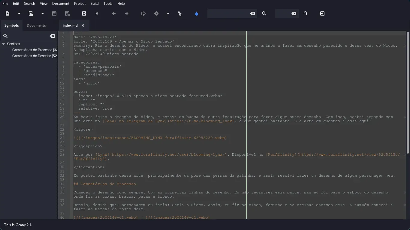 E assim, decidi explorar mais o Hugo, e simplesmente amei. Pois, eu não tenho mais aquela interface complicada do Wordpress, e agora tenho algo muito mais simples para escrever. Podendo escrever em qualquer editor de texto (como o Geany, que eu uso no meu Arch) e sem precisar estar conectado à internet. Gostei muito disso.